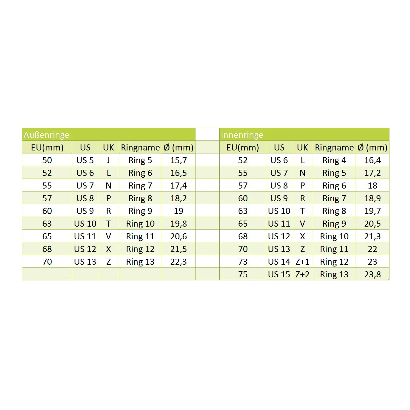| Außenring | Umfang | Ø | Innenring | Umfang | Ø | |